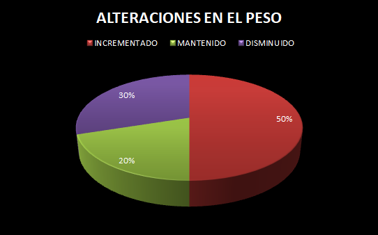 El 50% de la población encuestada ha incrementado su peso durante el embarazo, el 30% lo ha disminuido y sólo el 20% se mantenido en su peso.