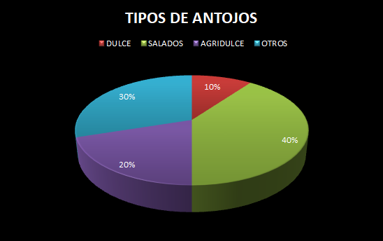 Durante el embarazo el 40% de la población gestante tiene antojos de tipo salado, el 20% agridulce, el 10% dulce y el 30% restante otro tipo de antojo.