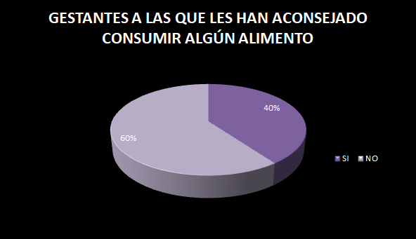 El 60% de la población encuestada, no ha recibido algún consejo de familiares o amistades respecto al consumo de algún alimento durante el embarazo, mientras que el otro 40% sí.