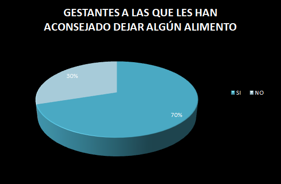 El 70% de las mujeres gestantes que fueron encuestadas, si han recibido consejos de evitar algún tipo de alimento durante su embarazo, mientras que el 30% restante no.