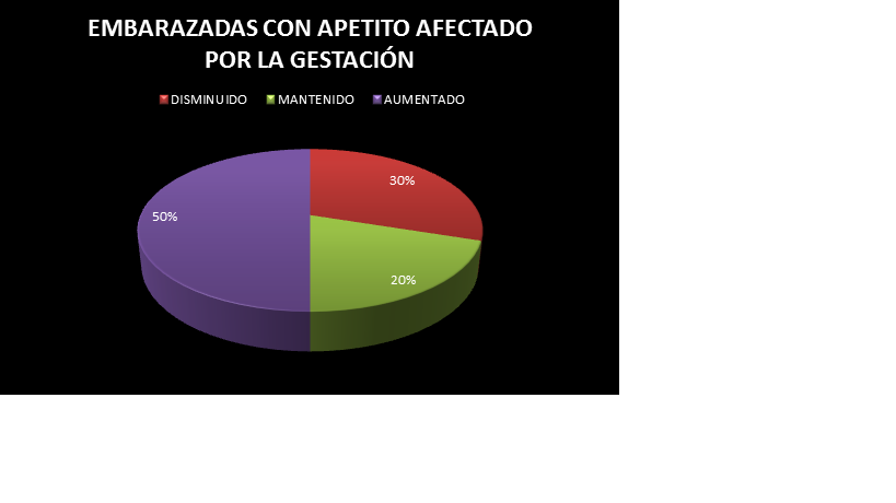 El apetito del 30% de la población gestante  ha disminuido, mientras que el 50% ha aumentado y el otro 20% se ha mantenido igual.