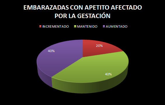 El apetito del 20% de la población gestante, ha disminuido, mientras que el 40% ha aumentado y el otro 40% se ha mantenido igual.