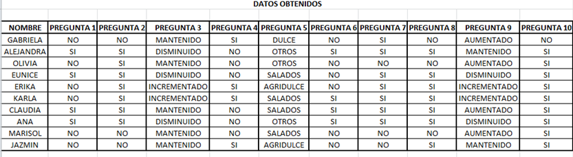 Con base en la encuesta a las 10 mujeres embarazadas (se muestran las preguntas en la sección de anexos) se obtuvo la siguiente información: