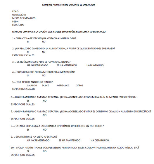 Este estudio como su nombre lo indica busca determinar si las mujeres gestantes realizan cambios alimenticios durante el embarazo, a través de la problemática que hoy en día como sociedad vivimos al no tener una educación alimenticia, siendo uno de los países con mayor índice de sobrepeso.  Al carecer de ello, es totalmente lógico que no se consuman los nutrientes necesarios durante el embarazo, a pesar de que actualmente los medios, redes sociales y TIC’s busquen concientizar a la sociedad de cuidar lo que come, de ahí surge la necesidad de dicha investigación que tiene como objetivo general: